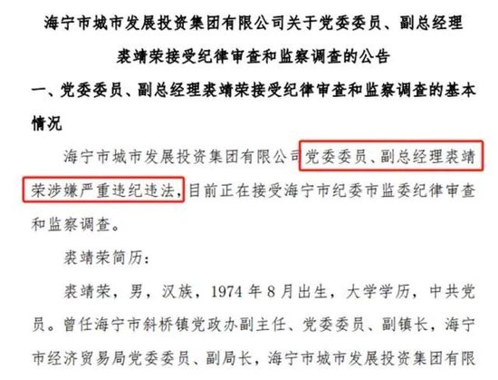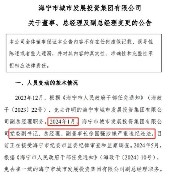 2024年1月9日,海宁城投发布了《海宁市城市发展投资集团有限公司关于高级管理人员涉嫌重大违法违纪被调查的公告》(以下简称“公告”)。公告称,公司党委副书记、总经理、副董事长徐国强涉嫌严重违纪违法,目前正在接受海宁市纪委市监委纪律审查和监察调查。