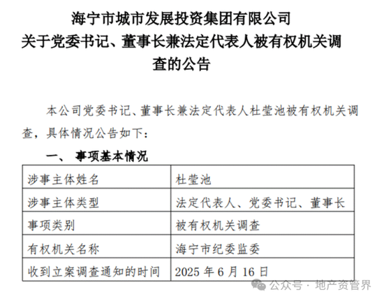 6月18日,浙江海宁市城市发展投资集团有限公司(以下简称“海宁城投”)突发公告称,公司党委书记、董事长杜莹池涉嫌严重违纪违法,目前正接受海宁市纪委监委纪律审查和监察调查。